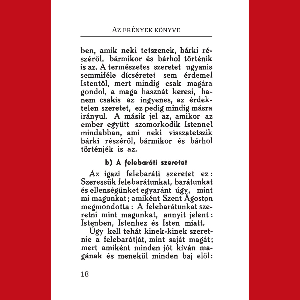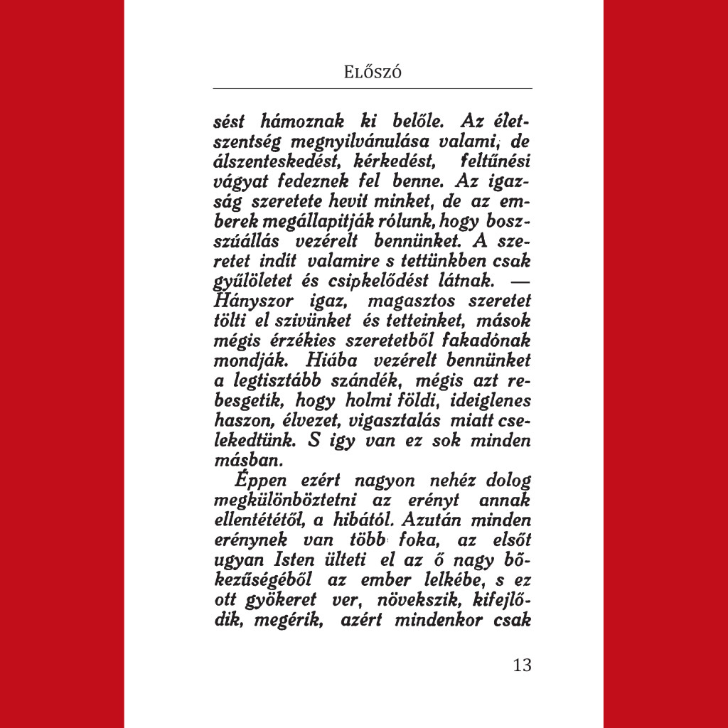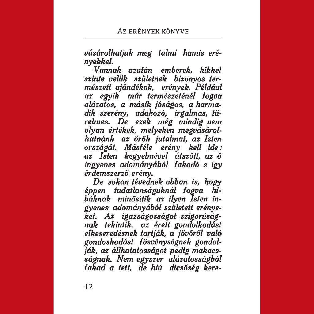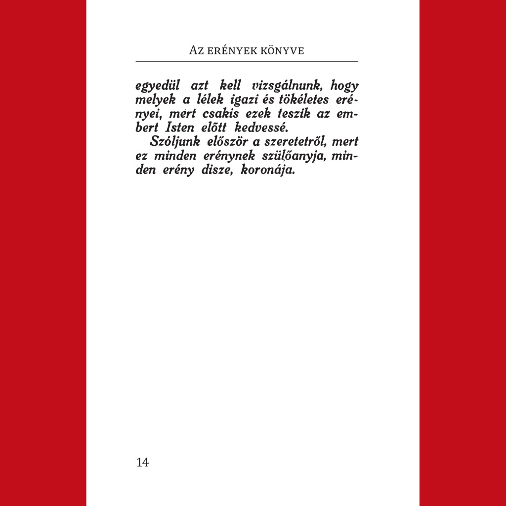 Jelen művében különválasztja az igazi erényt a látszólagostól. Buzdít, hogy fellelkesülve sajátítsuk is el az igaziakat. Összesen 42 nemes tulajdonságról szól, többek között az alábbi erényeket tárgyalja: alázatosság, békesség, béketűrés, bizalom, bőkezűség, bűnbánat, egyszerűség, engedelmesség, erősség, hit, igazságosság, irgalmasság, magányosság, mértékletesség, okosság, remény, szabadság, szegénység, szelídség, szeretet, tisztaság, vallásosság.