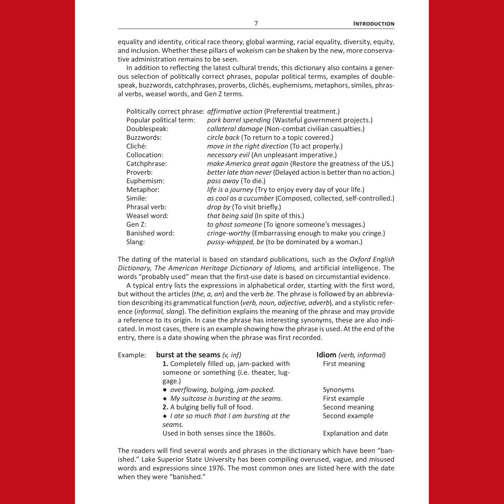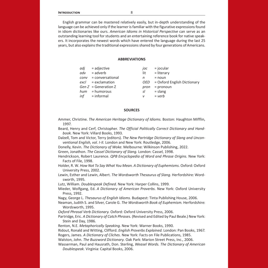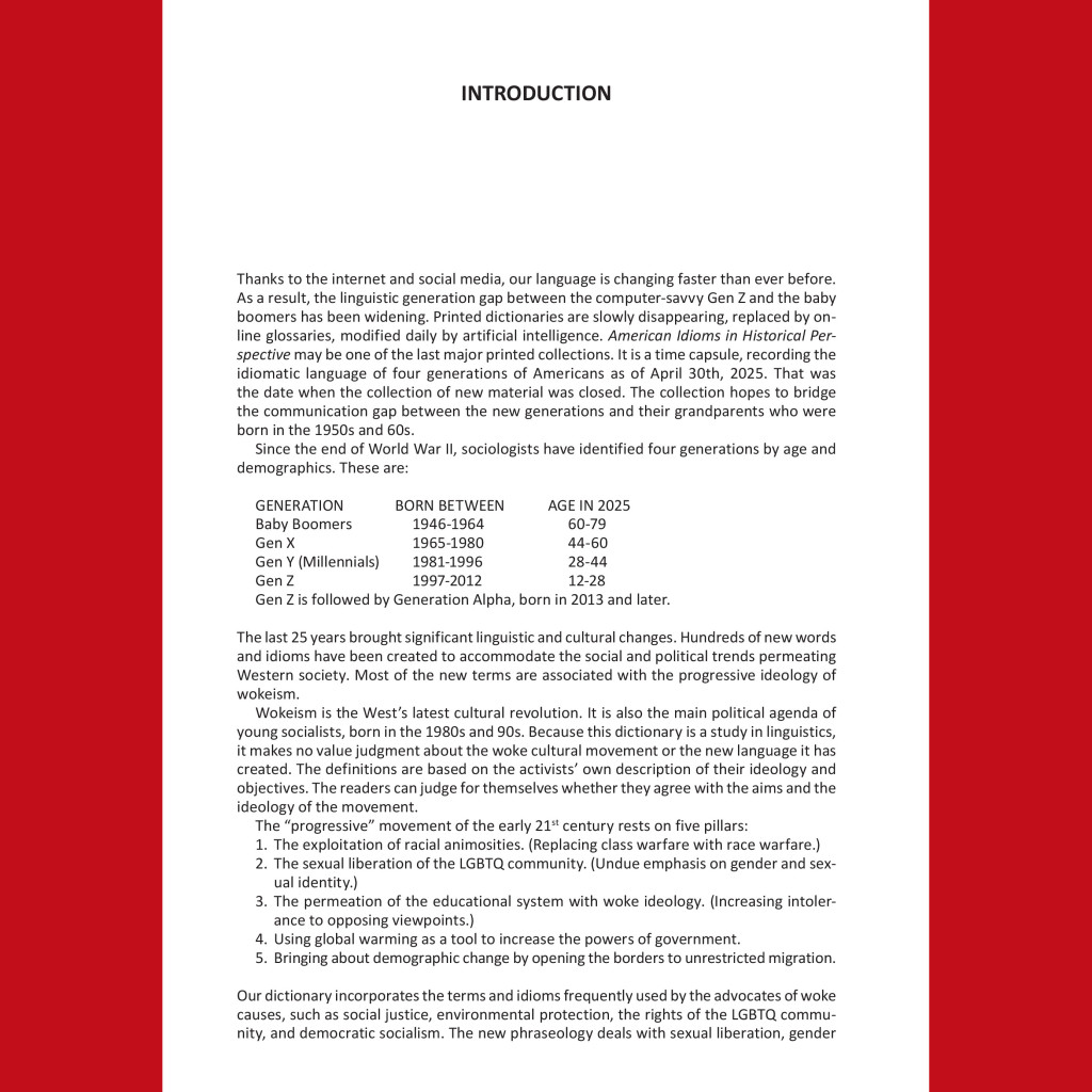 American Idioms in Historical Perspective is a time capsule of 2025 that registers the most popular phrases and buzzwords used by the last four generations. It also reflects the culture war among the prevailing political philosophies. The woke terms dealing with gender, race, social justice and political correctness are objectively defined and illustrated with examples. The book is rich in euphemisms, metaphors, catchphrases and slang terms shared by the baby boomers, their children and grandchildren. The reader will find the definition of words and phrases like snowflakes, Oppression Olympics, toxic masculinity, and gender affirming care. There are many references to the origin and the first recorded date of 11,500 words and phrases.