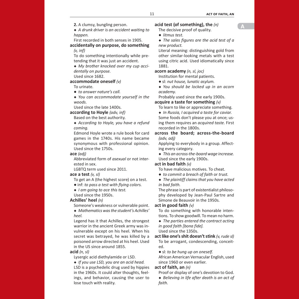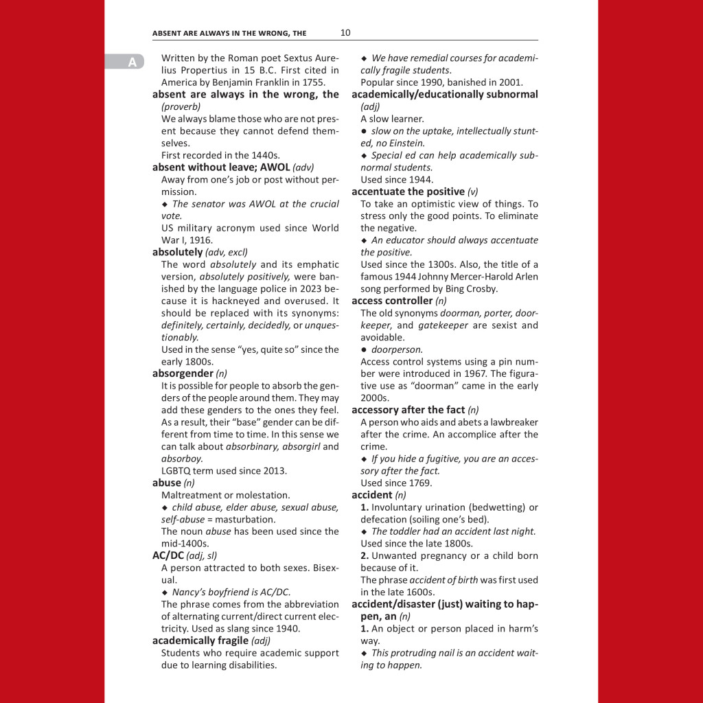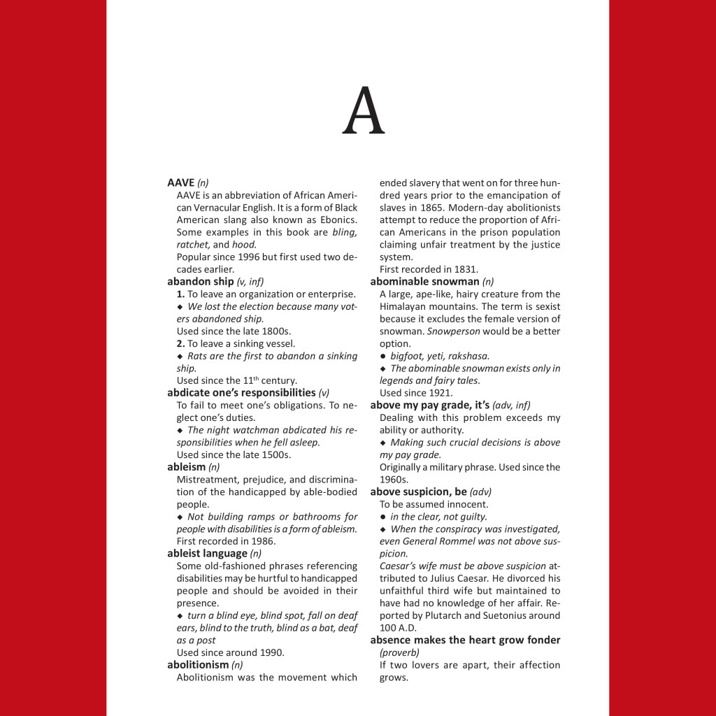 American Idioms in Historical Perspective is a time capsule of 2025 that registers the most popular phrases and buzzwords used by the last four generations. It also reflects the culture war among the prevailing political philosophies. The woke terms dealing with gender, race, social justice and political correctness are objectively defined and illustrated with examples. The book is rich in euphemisms, metaphors, catchphrases and slang terms shared by the baby boomers, their children and grandchildren. The reader will find the definition of words and phrases like snowflakes, Oppression Olympics, toxic masculinity, and gender affirming care. There are many references to the origin and the first recorded date of 11,500 words and phrases.