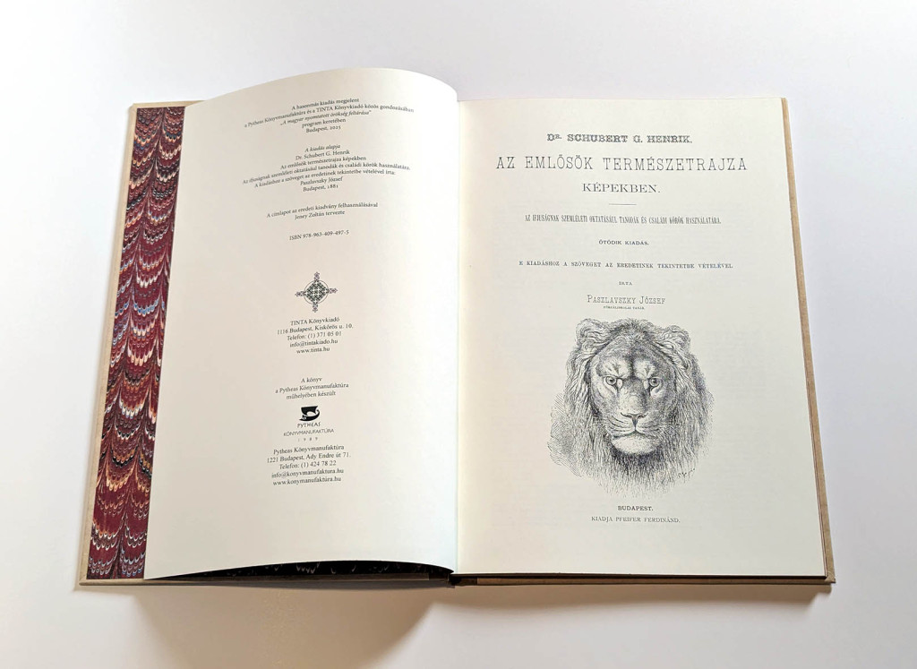 Napjaink városi embere a természettől elszakadt, ezért is szívet melengető az Emlősök természetrajza képekben című, az eredetivel mindenben megegyező reprint album lapozgatása. A könyv használójának óhatatlanul is Fekete István természetleíró írásai jutnak az eszébe. A kötet közreadói, a TINTA Könyvkiadó és a Pytheas Könyvmanufaktúra biztosak benne, hogy sokaknak szerez örömet a magas színvonalon elkészített ismeretterjesztő kiadvány. Az eredeti kiadvány 1881-ben jelent meg, a korabeli nyomdatechnika csúcstermékeként. A jelen kiadás korunk digitális nyomdatechnikájának felhasználásával készült.