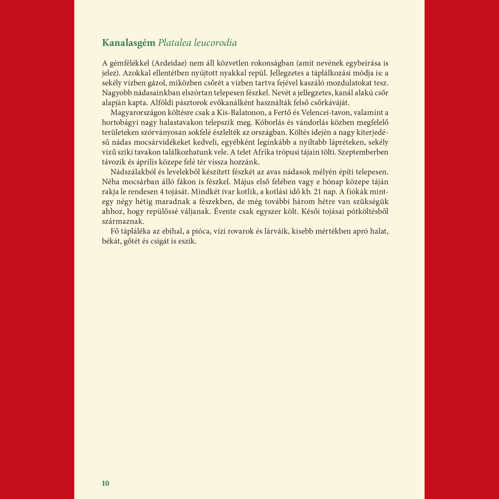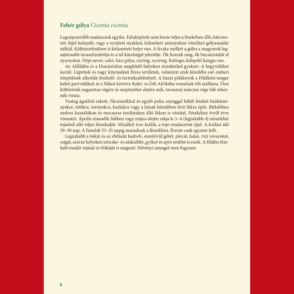 A képek mellett megtaláljuk a madarak rövid leírását is. Megtudhatjuk többek között az adott madár főbb jellemzőit: hol él, mivel táplálkozik, általában hány tojást rak, miként neveli fiókáit. Információt kapunk továbbá az egyes madarak szaknyelvi és népnyelvi neveinek eredetéről, valamint énekükről, hangjukról.