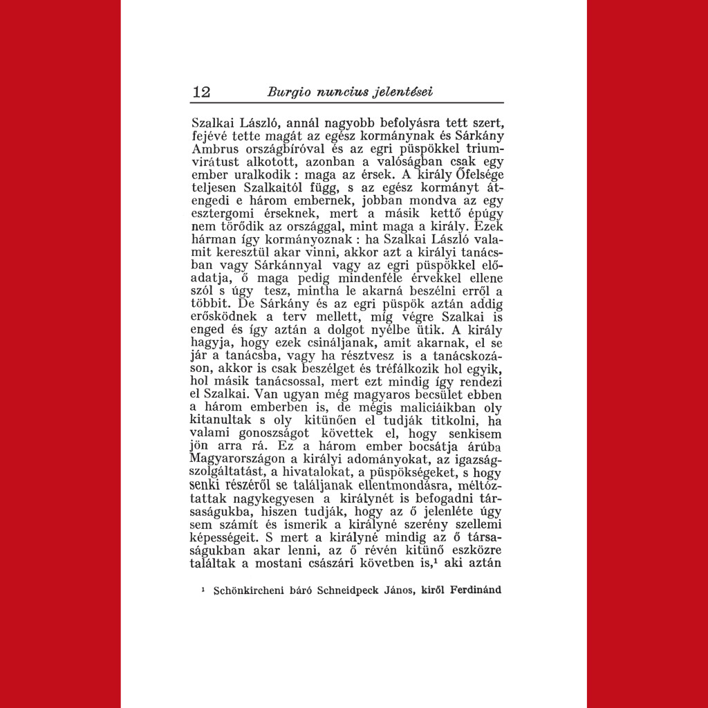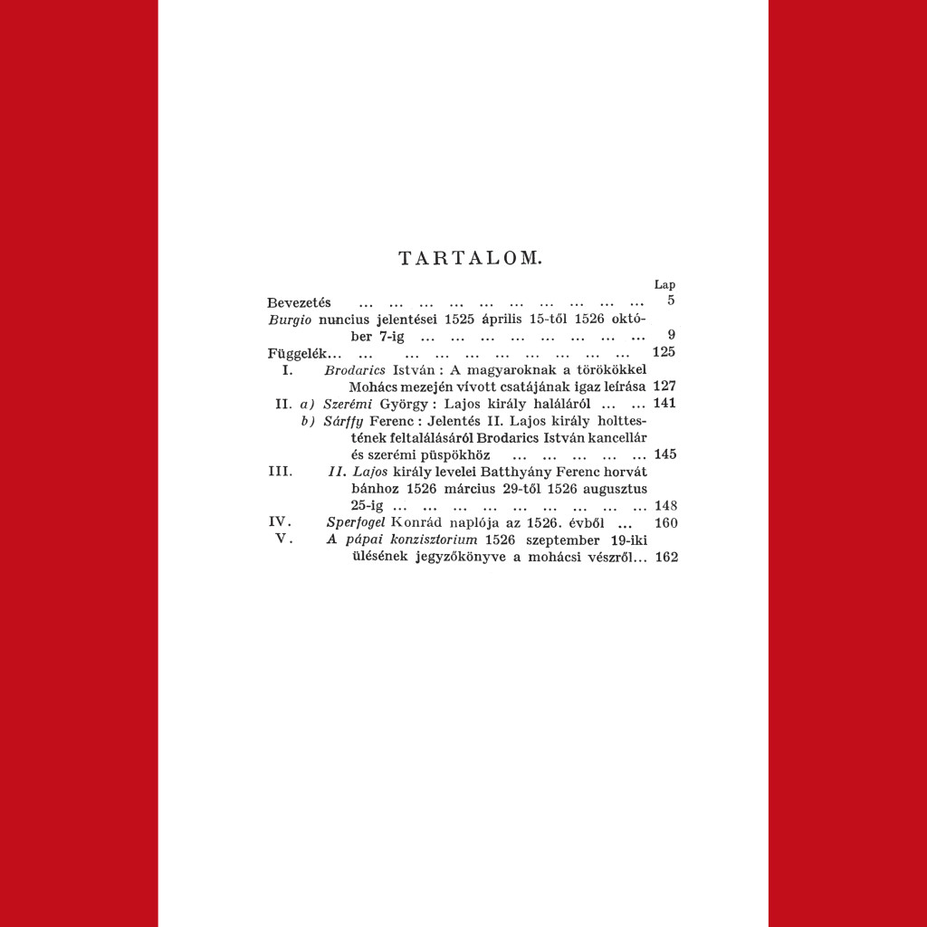 Alcím Burgio nuncius jelentései 1525-ből és 1526-ból; Bodarics István A mohácsi csata igaz leírása; Sárffy Ferenc II. Lajos király holttestének feltalálásáról; A pápai konzisztórium jelentése a mohácsi vészrőlSorozatszám 36Oldalszám 168Kötés típusa puhafedelesFormátum A/5Megjelenés dátuma 2026. 04. 30.Item number 9789634095224Status NEW  Weight 200 g/pcs