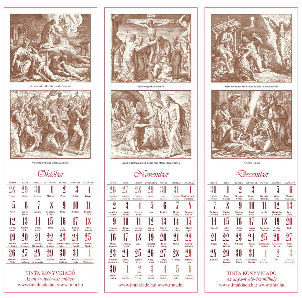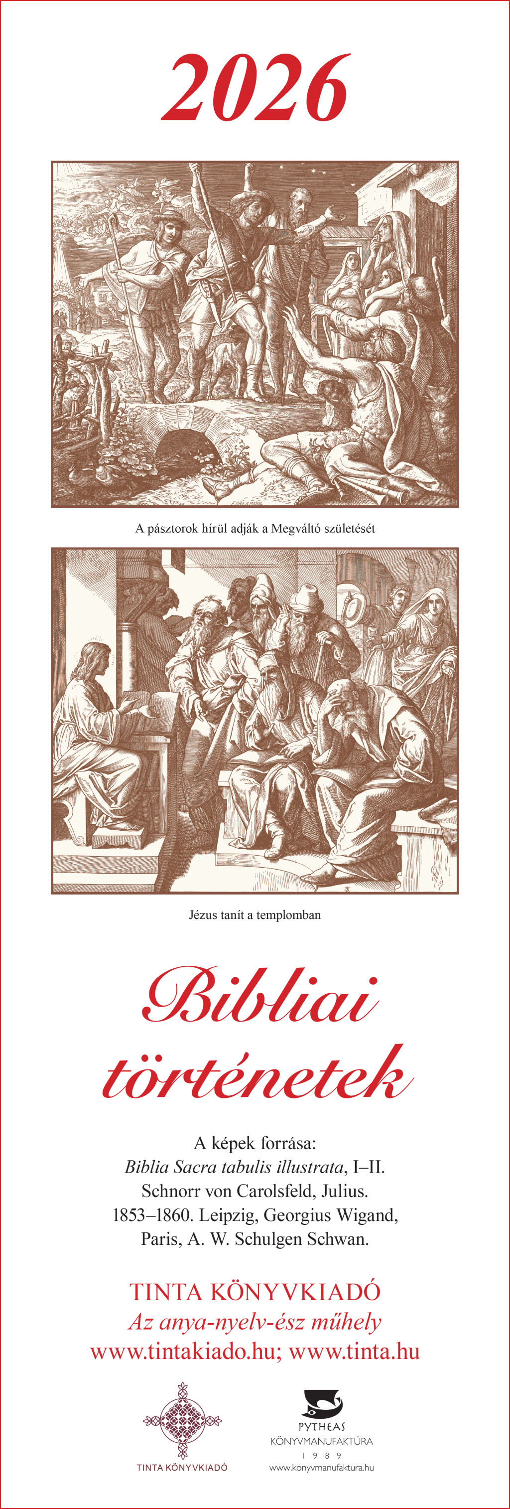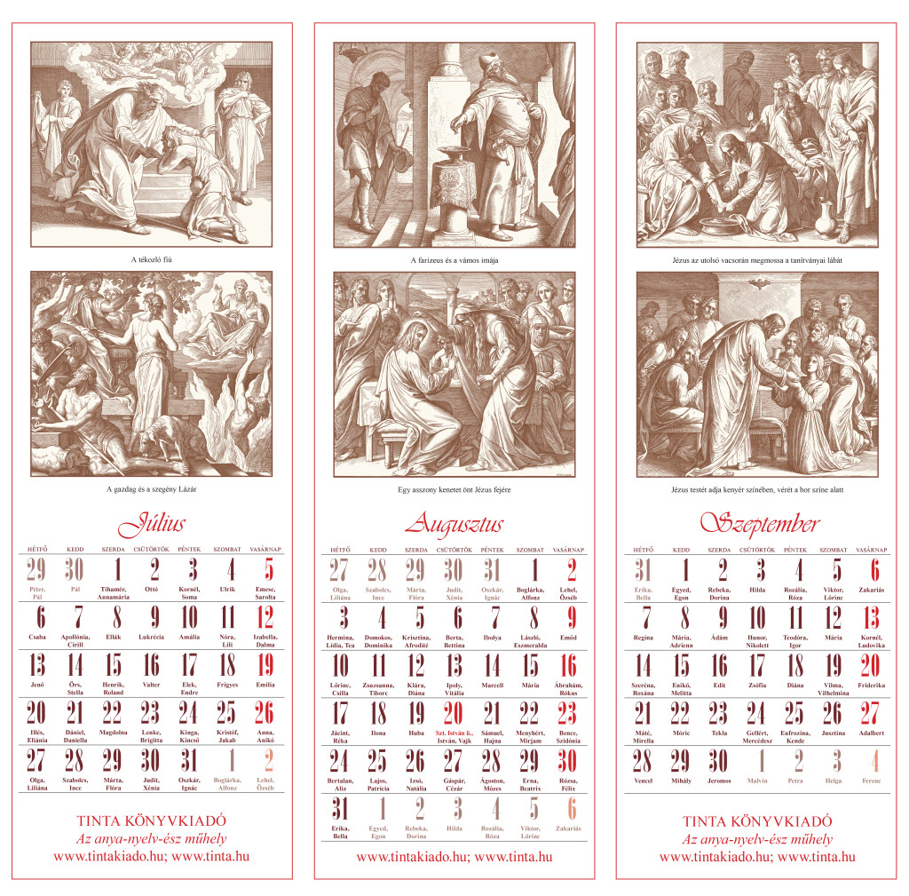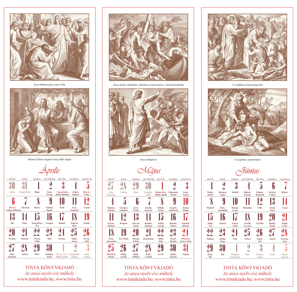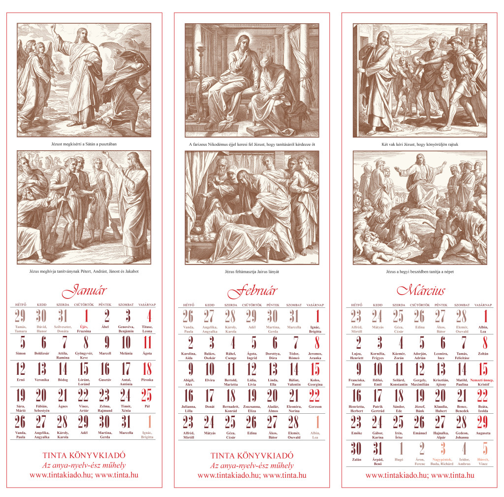 Színes, lapozható hosszúkás falinaptár, felül spirálozva. Szélessége 16 cm, magassága 48 cm. A címlap és mind a 12 hónap oldala két-két 13 x 11 cm-es nívós metszetet tartalmaz. Így a falinaptárban 26 látványos bibliai képben gyönyörködhetünk. Év végén a naptárból kivágva külön is használhatók dekorációnak. A képek alatt a hónap napjai heti beosztásban láthatók, feltüntetve az adott napon ünnepelt névnapot is.