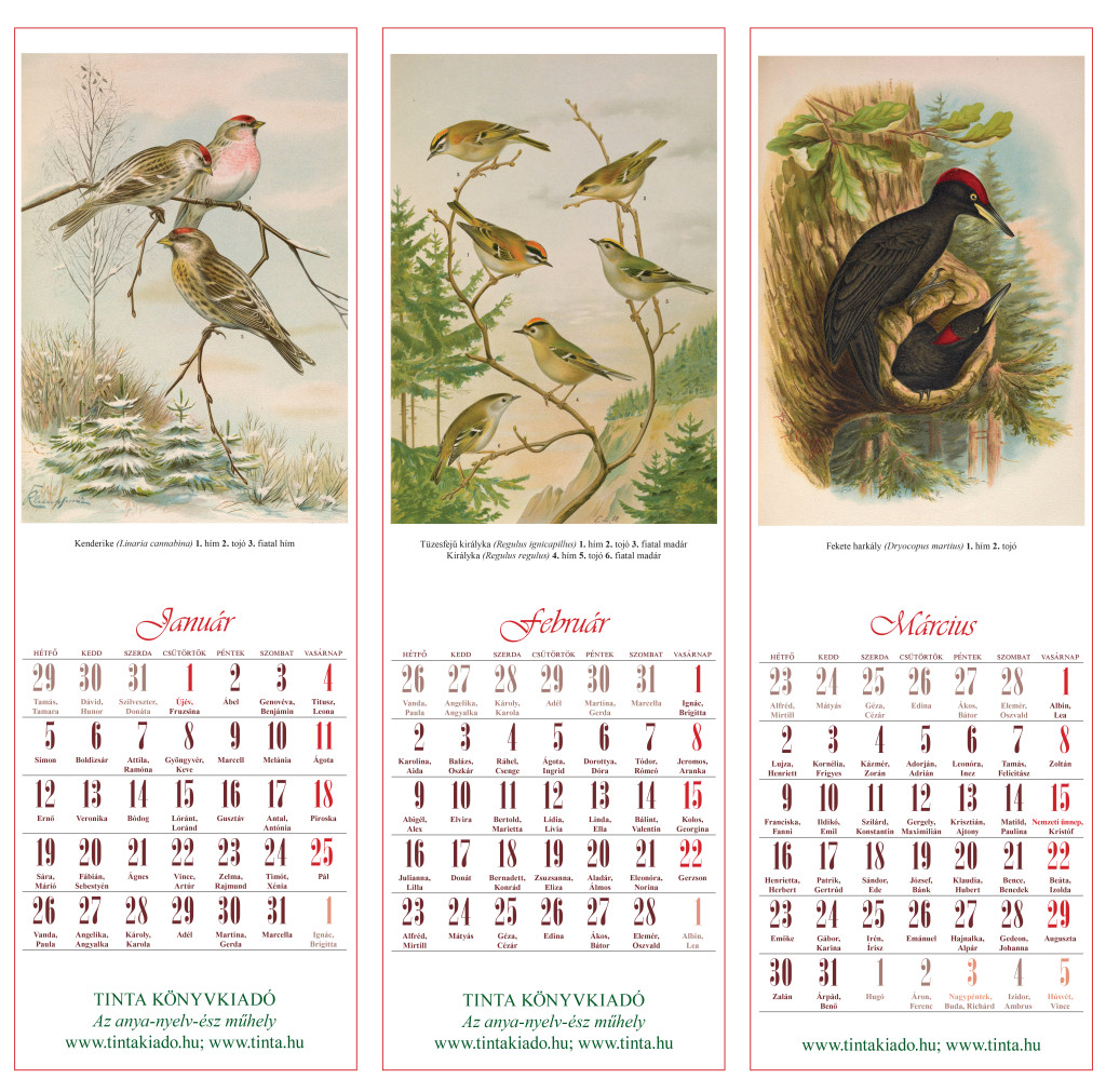 Január: Kenderike (Linaria cannabina) 1. hím 2. tojó 3. fiatal hím