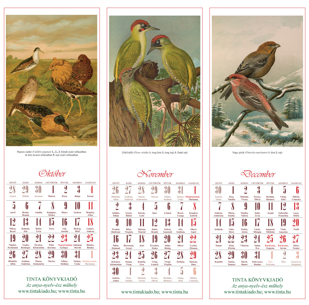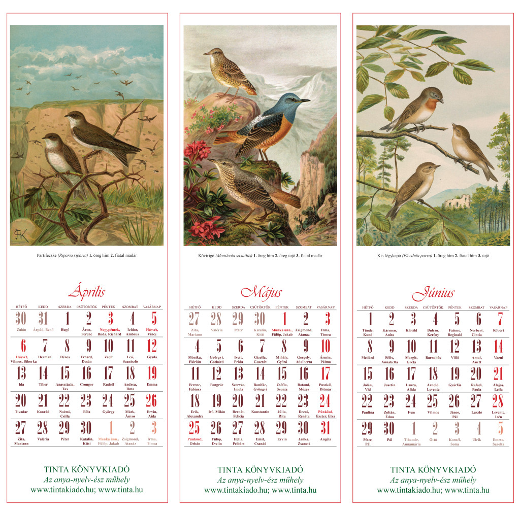 Színes, lapozható hosszúkás falinaptár, felül spirálozva. Szélessége 16 cm, magassága 48 cm. A címlap és mind a 12 hónap egy-egy 14 x 20 cm színes képet tartalmaz. Év végén a naptárból kivágva külön is használhatók dekorációnak. A képek alatt a hónap napjai heti beosztásban láthatók, feltüntetve az adott napon ünnepelt névnapot is.