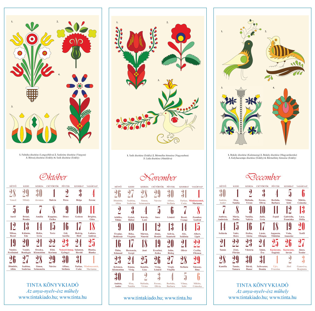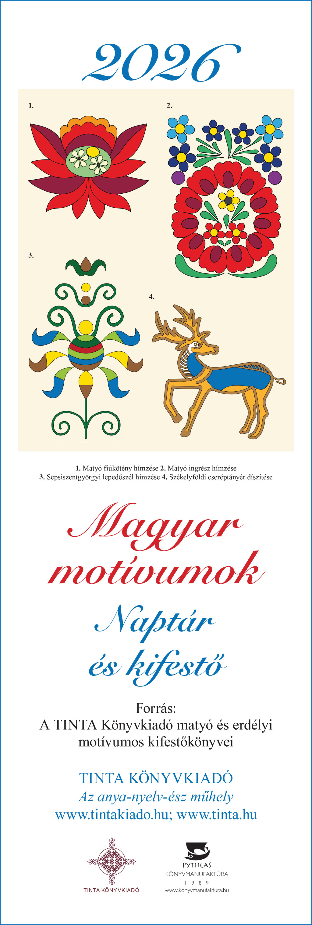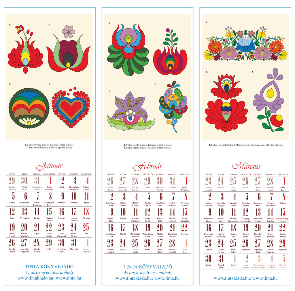 A naptár lapjainak hátoldalán a színes motívumok fekete-fehér vonalas rajzát is elhelyeztük, így kifestőként is használható.