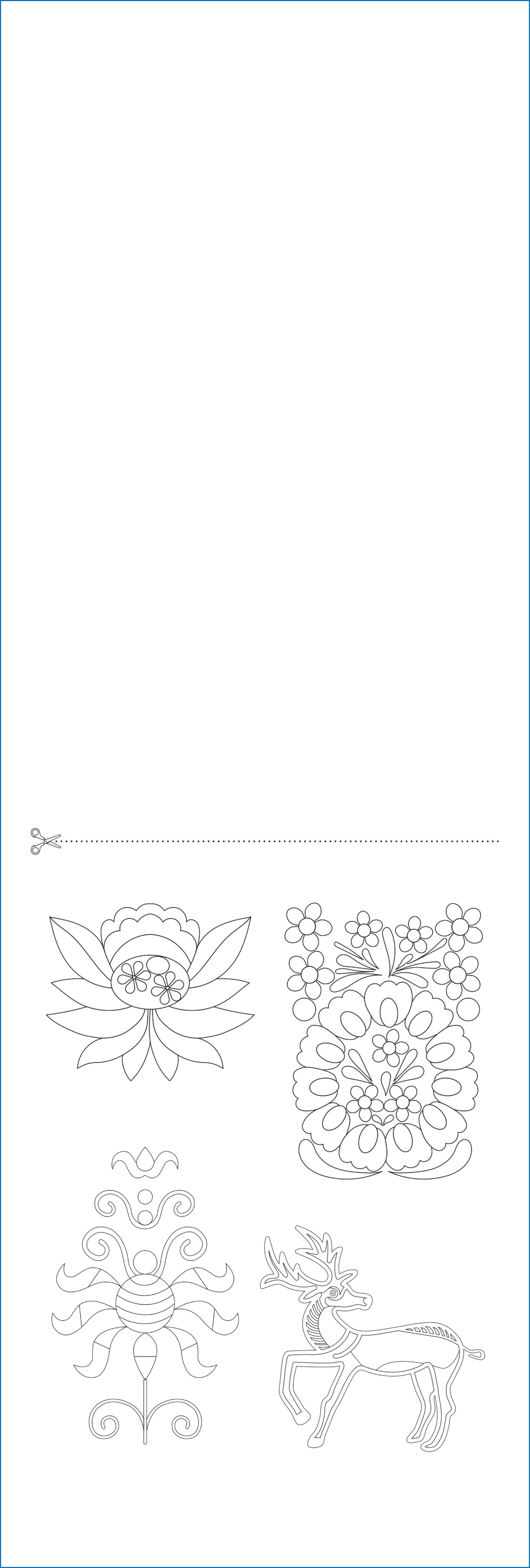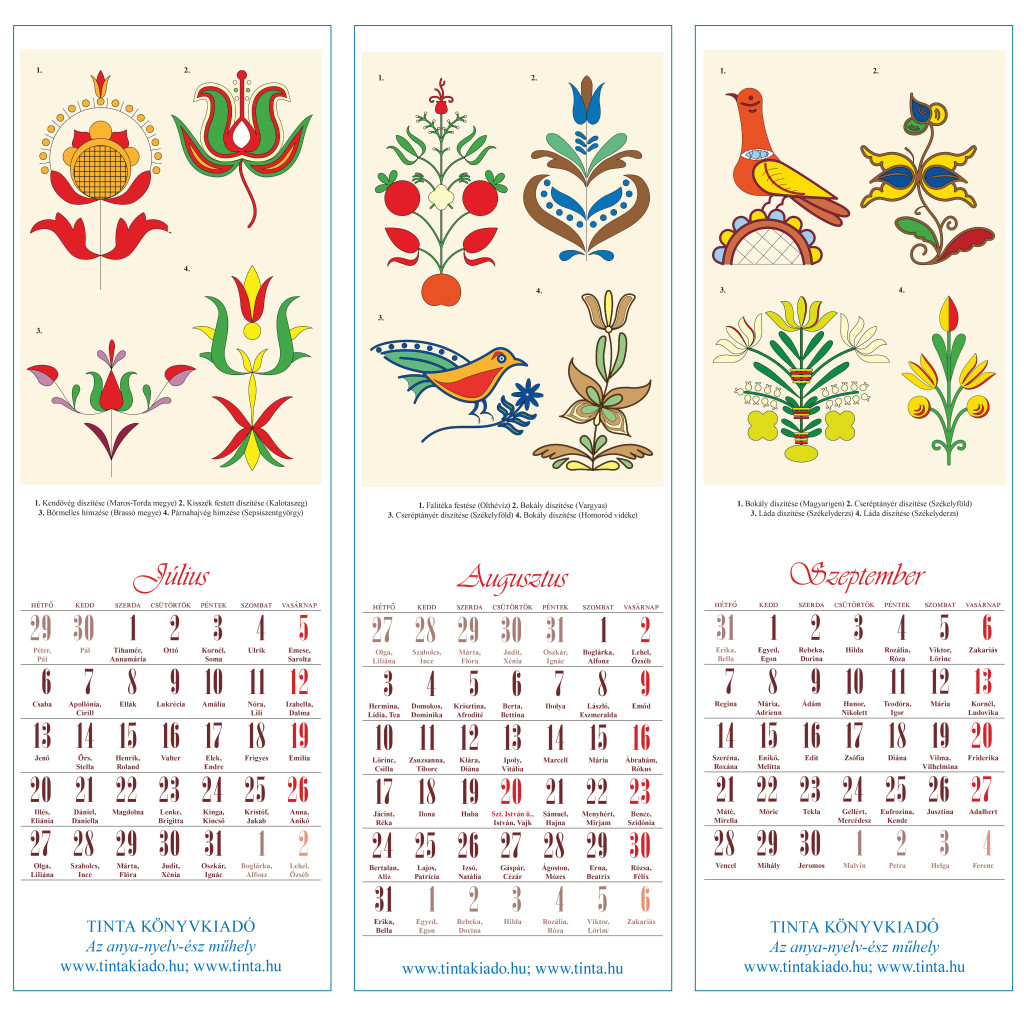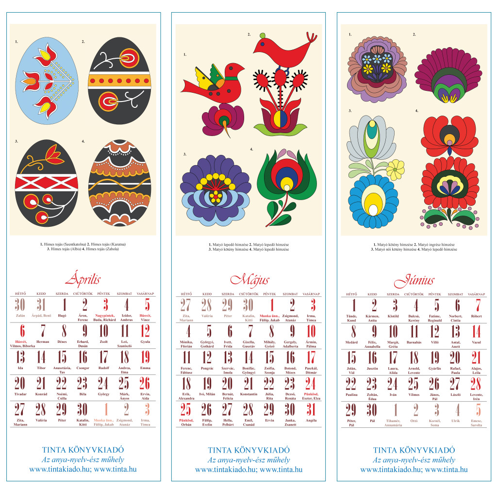 A naptár lapjainak hátoldalán a színes motívumok fekete-fehér vonalas rajzát is elhelyeztük, így kifestőként is használható.
