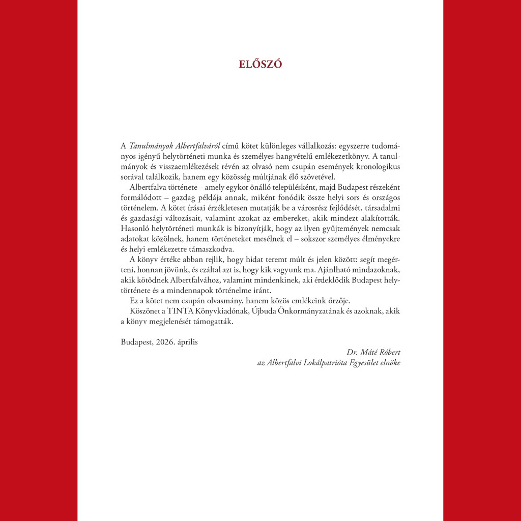 A Tanulmányok Albertfalváról című kötetet nemcsak albertfalvi olvasóknak ajánljuk, hanem mindazoknak, akik érdeklődnek Albertfalva múltja és egyáltalán a történelem iránt.